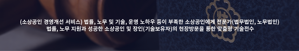(소상공인 법률, 노무 서비스 지원) 법률 및 노무 서비스 사각지대에 놓여 있는 연합회 소속 단체 및 지역조직 내 소상공인에게 전문 법률, 노무 상담지원 - (지원대상) 소상공인연합회 회원 단체 및 지역연합회 회원 등 법률, 노무 상담이 필요하다고 인정되는 소상공인 * 지원제외 : 소상공인정책자금 지원제외 업종, 사치향락적 소비,투기조장업종 등 * 지원 가능 여부는 소상공인증빙서류를 연합회 담당자에게 제출하여 확인 - 지원내용